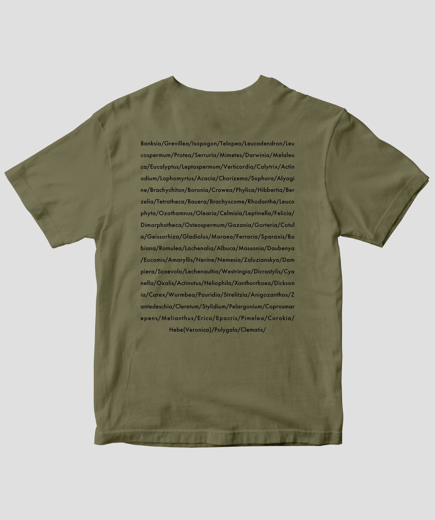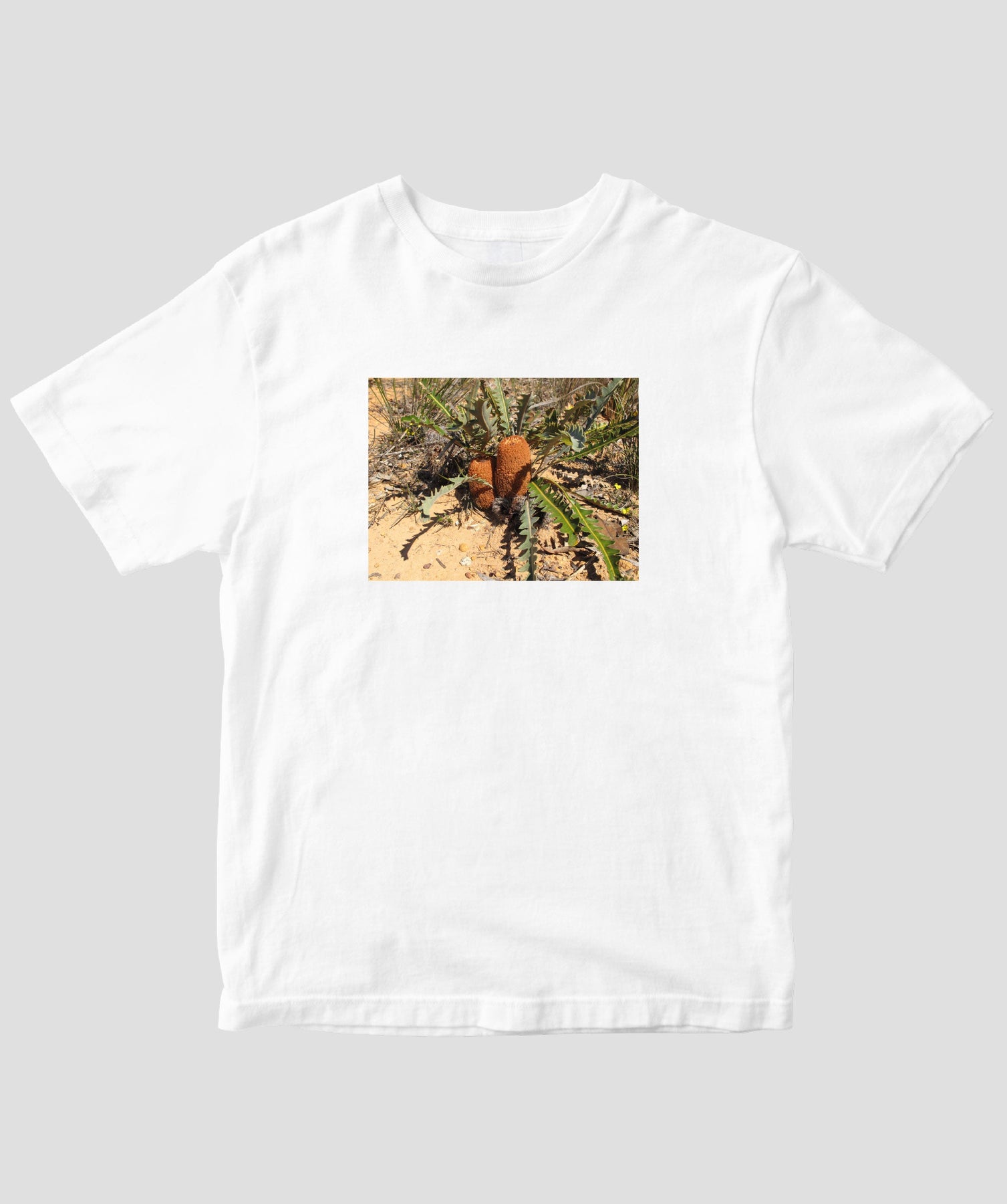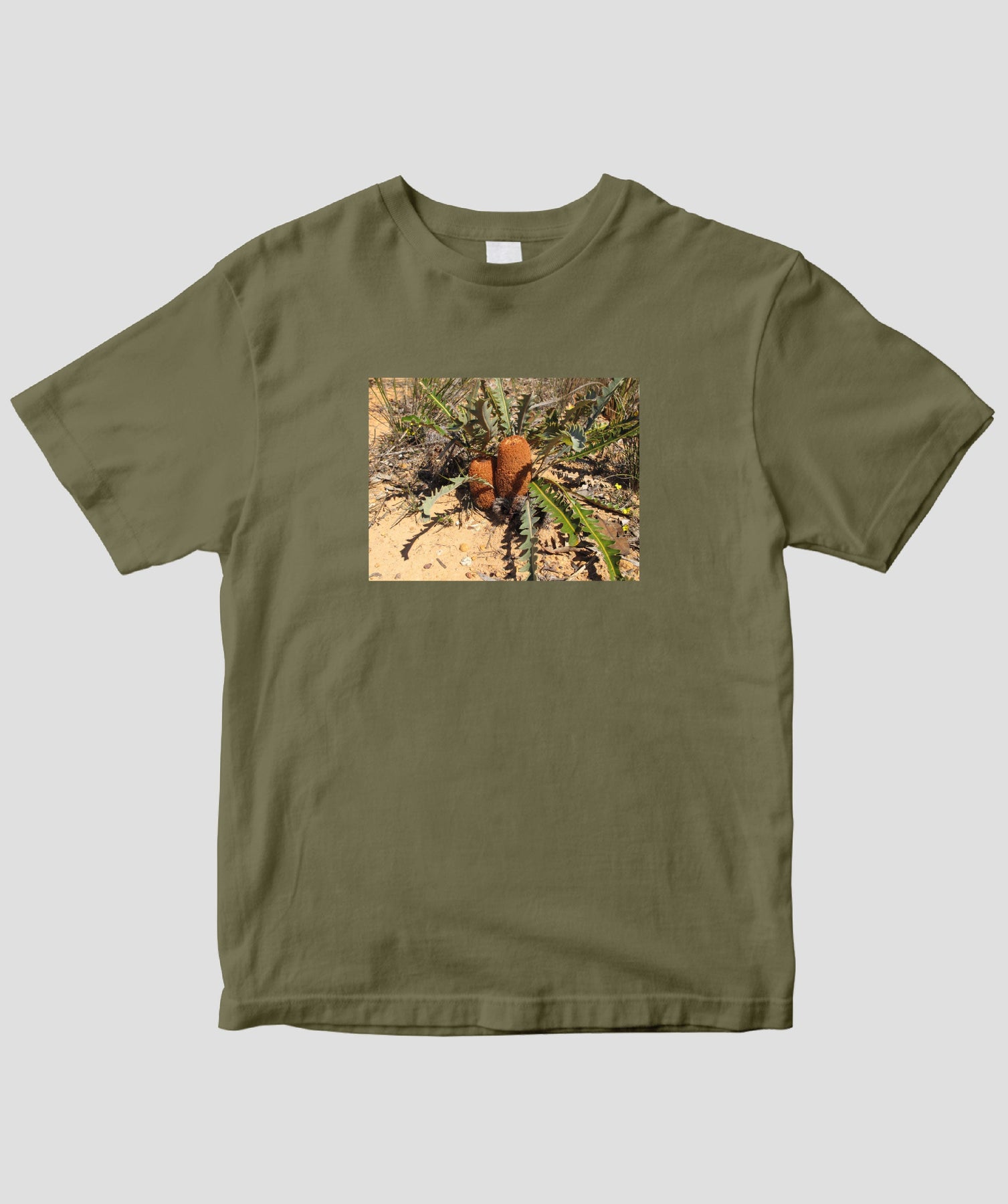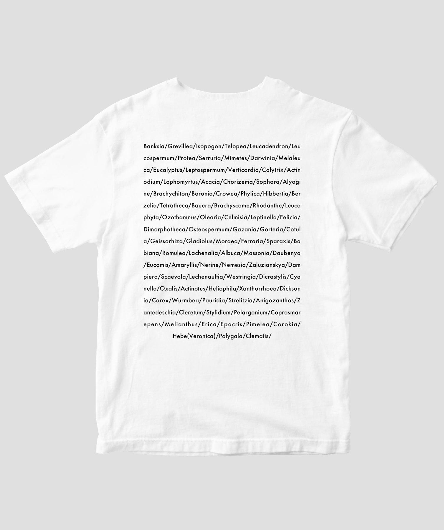 バンクシアの生命力を感じられるTシャツ。裏面には書籍で紹介している植物の名も。自生地に想いを馳せたくなる一枚です。