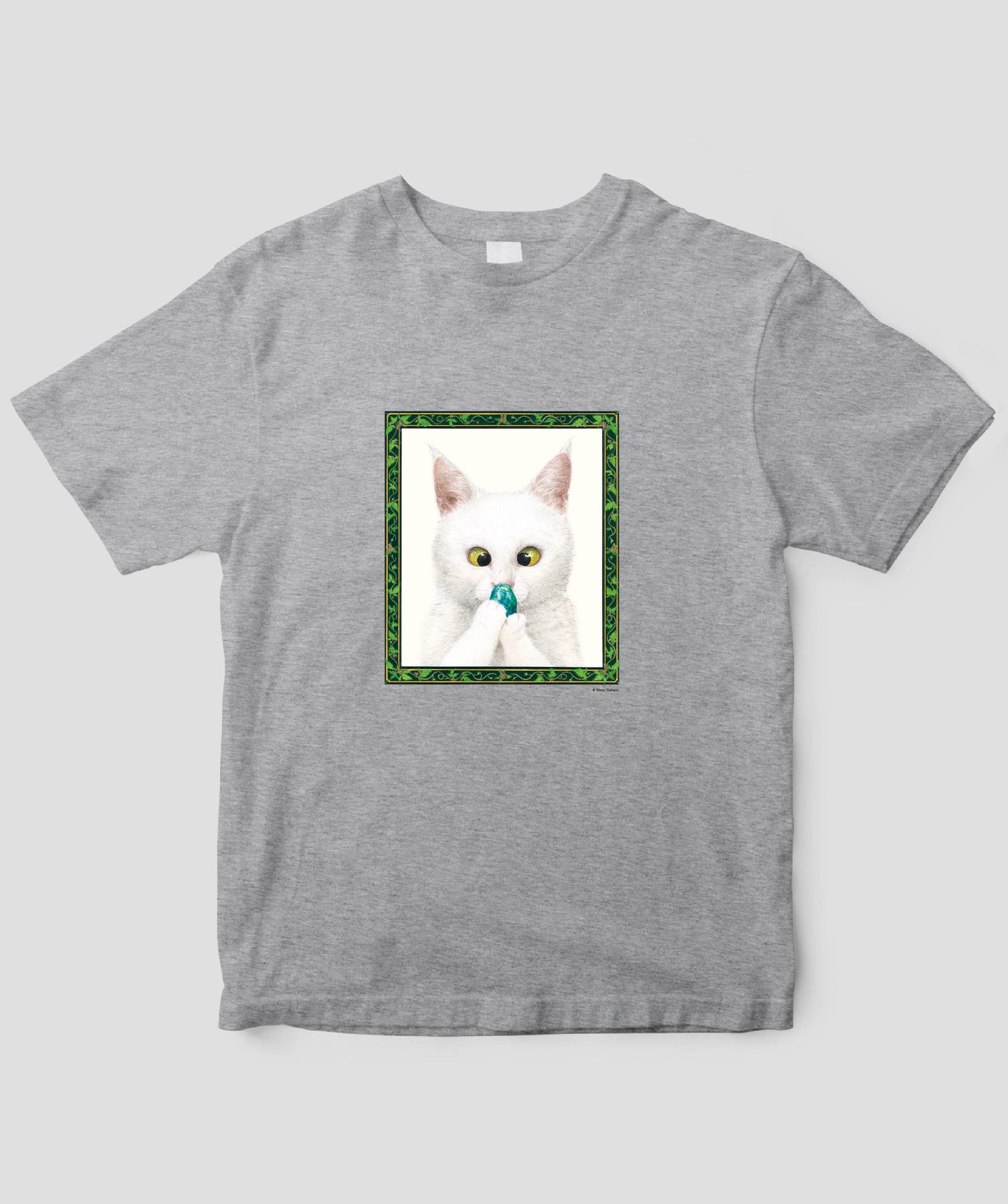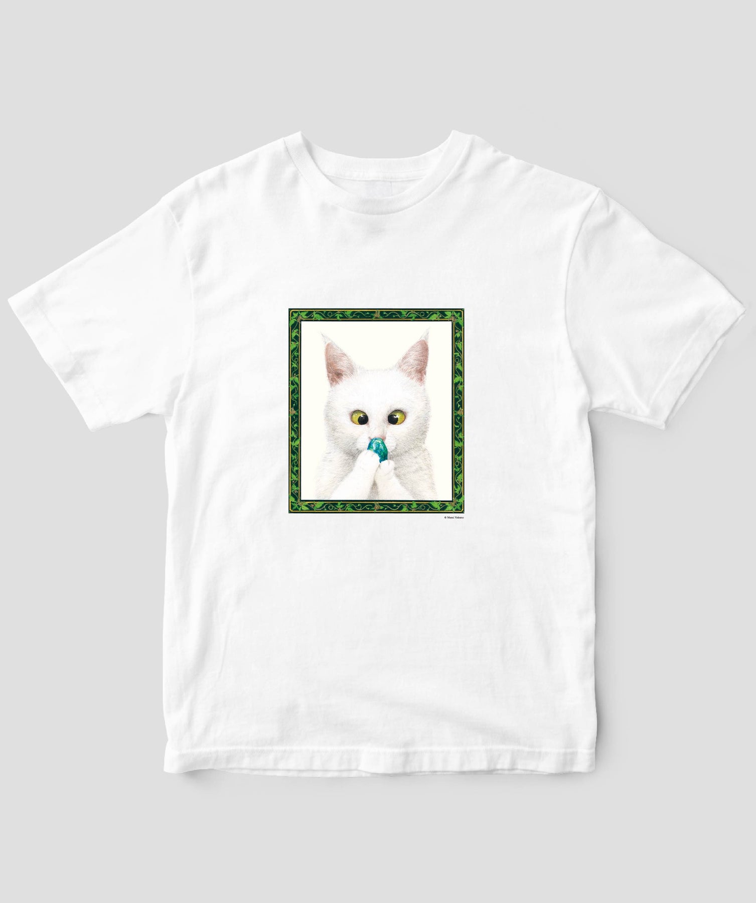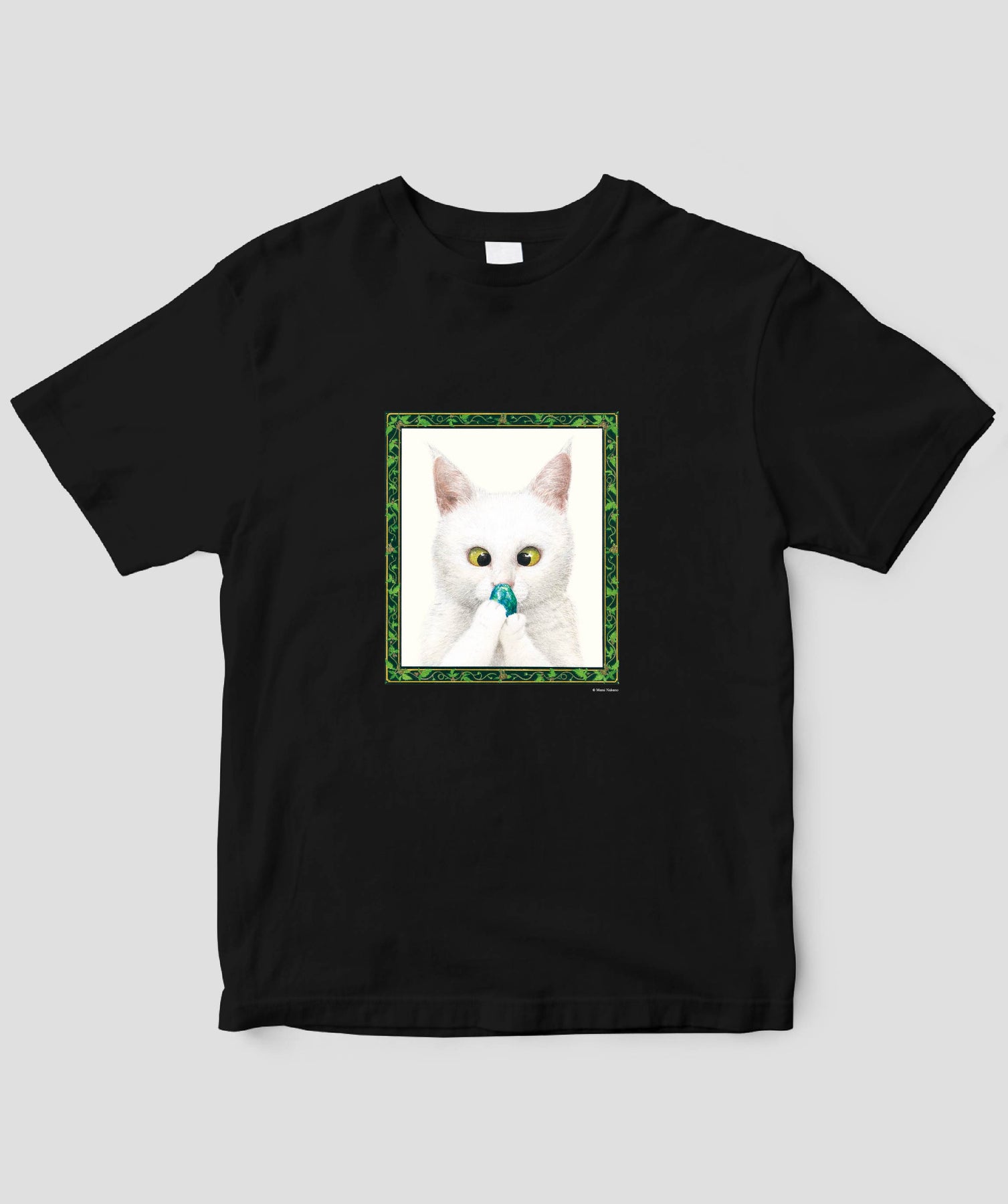 猫が色とりどりに輝く石を見つける場面を再現。アートな感性が光るTシャツです。