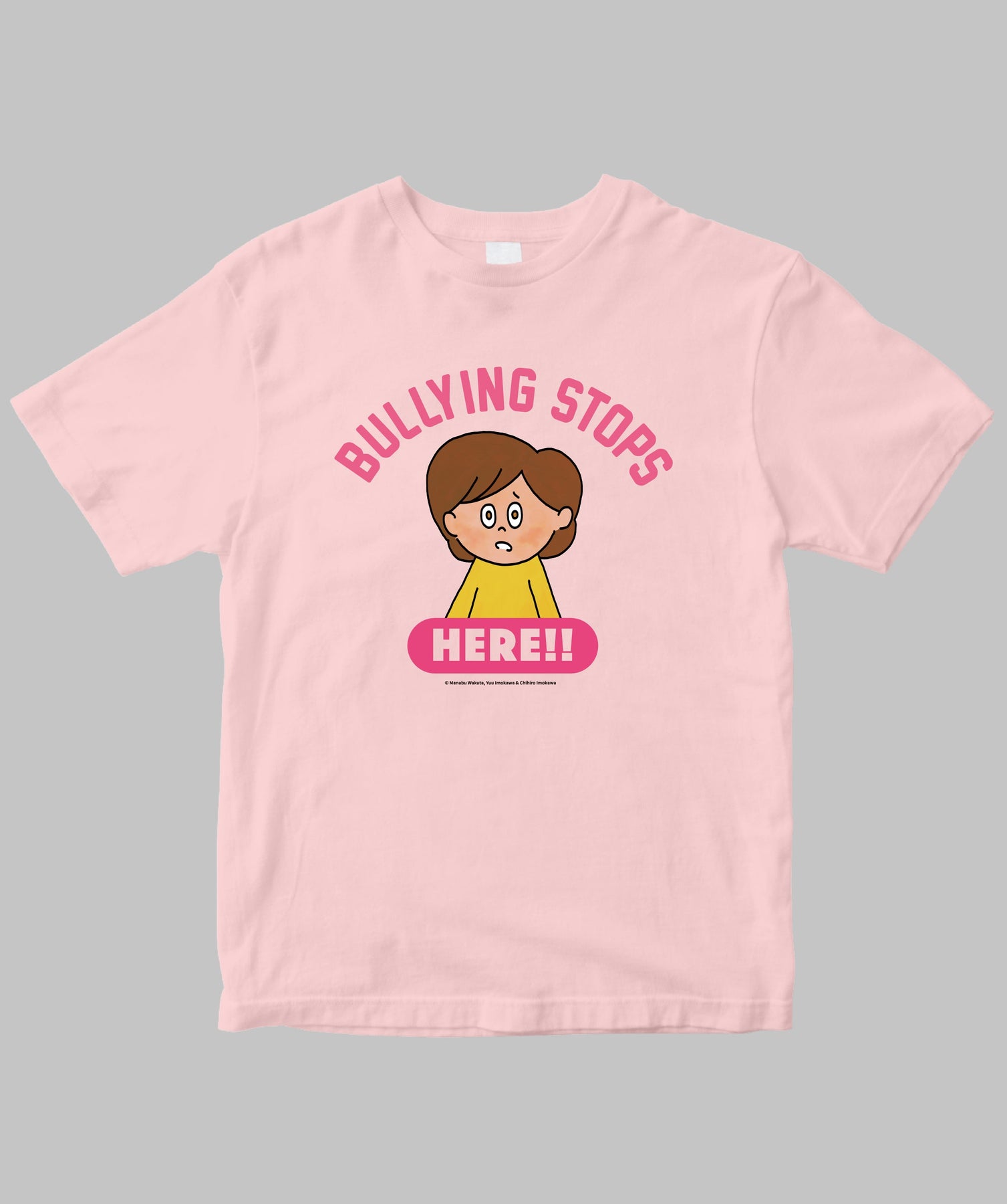 「BULLYING STOPS HERE!!」=「いじめはここで終わり!」という力強いメッセージを込めたTシャツです。「いじめ反対」の意思を示す活動、ピンクシャツデーの参加にもおすすめです。