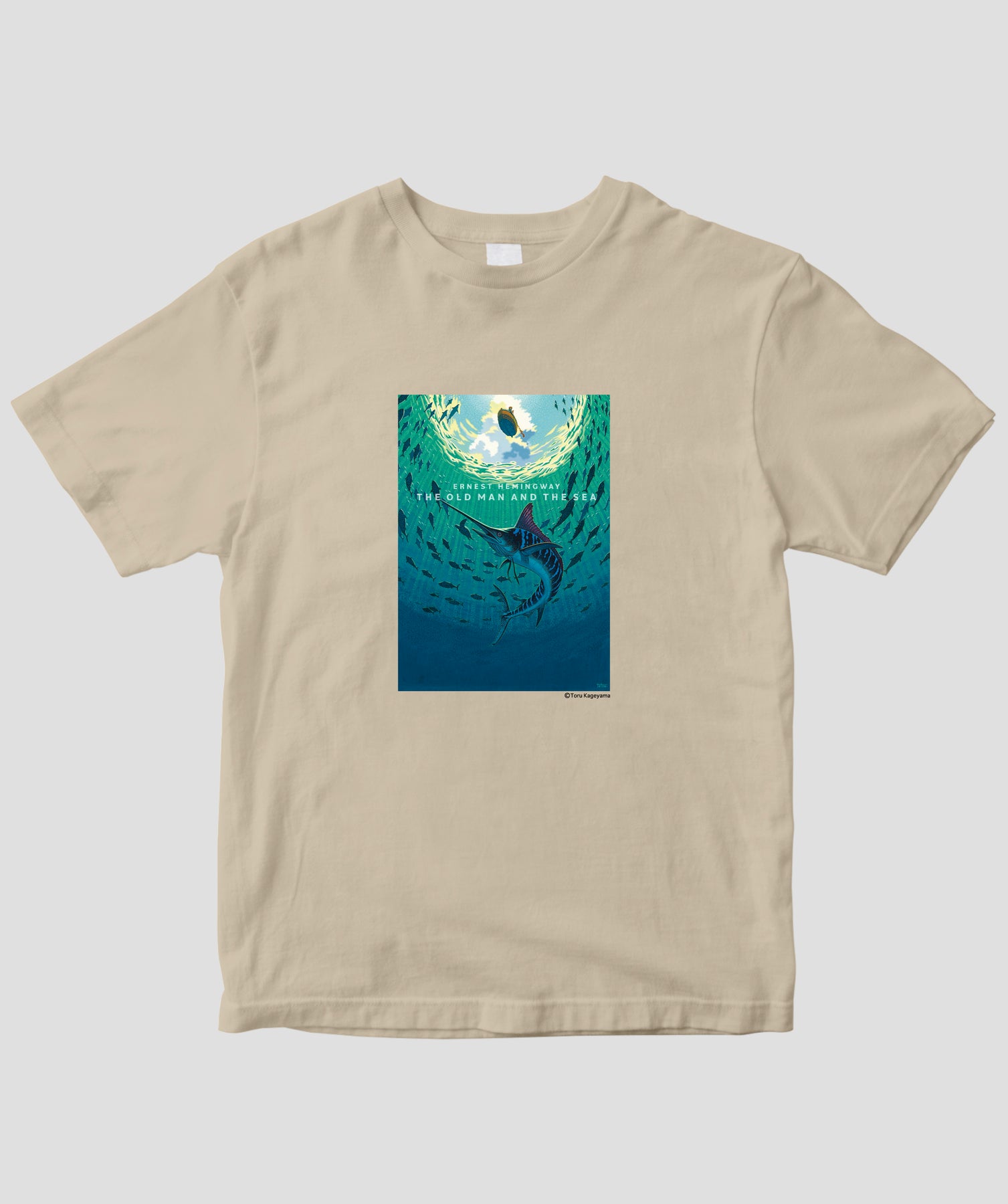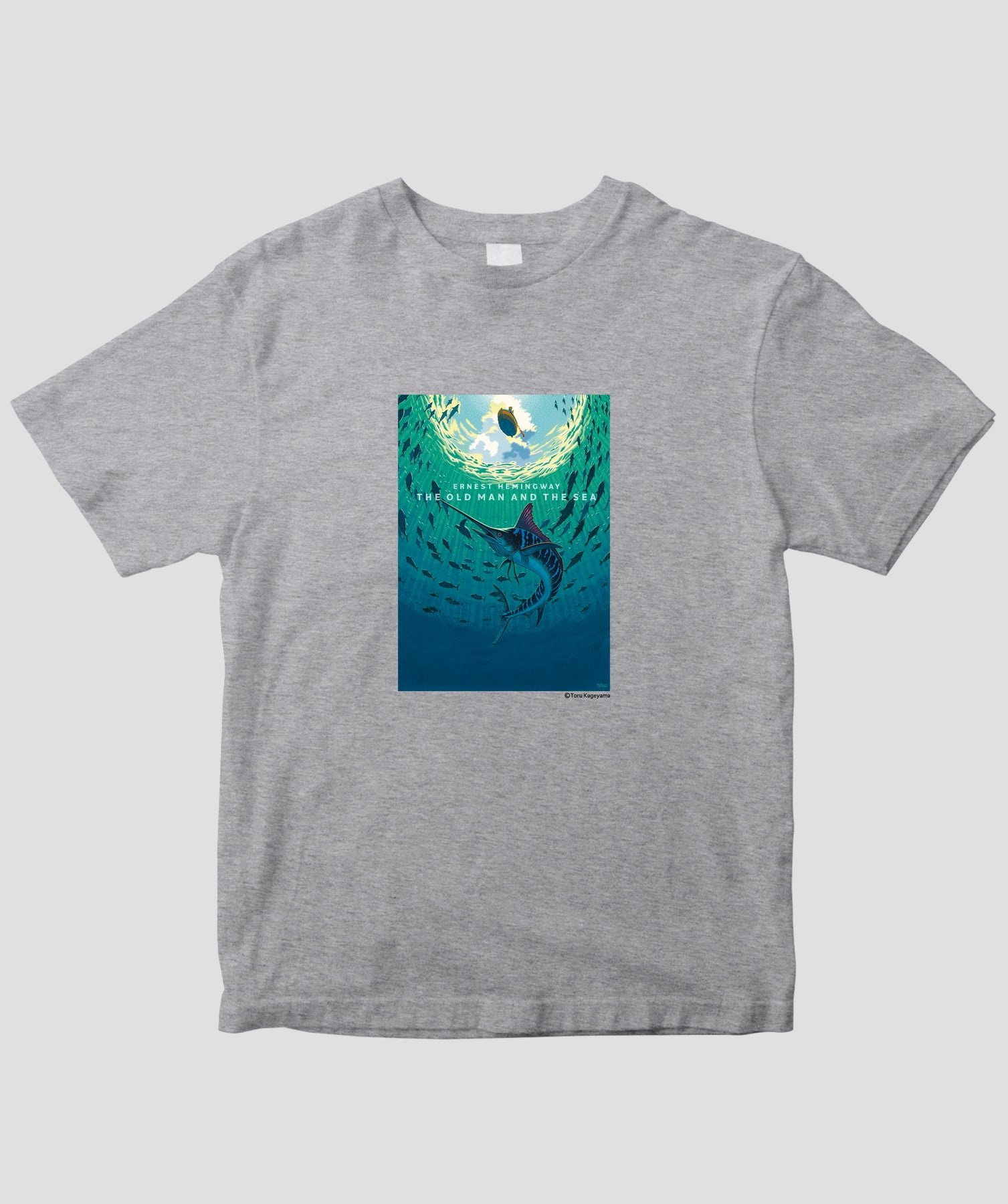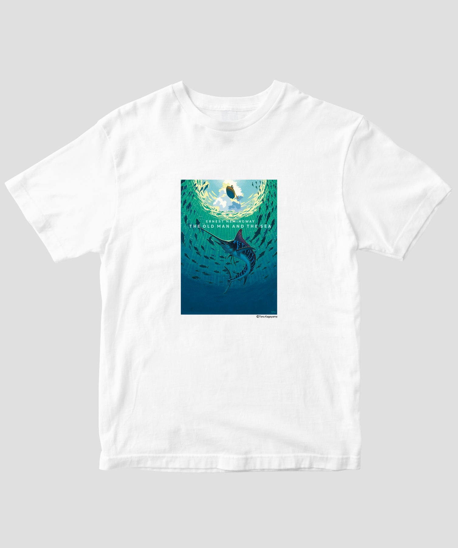 影山徹氏による、新潮文庫版の有名な表紙装画をフロントにデザイン。大海原の静謐さと、巨大なカジキとの闘いの高揚感が凝縮された美しいグラフィックです。